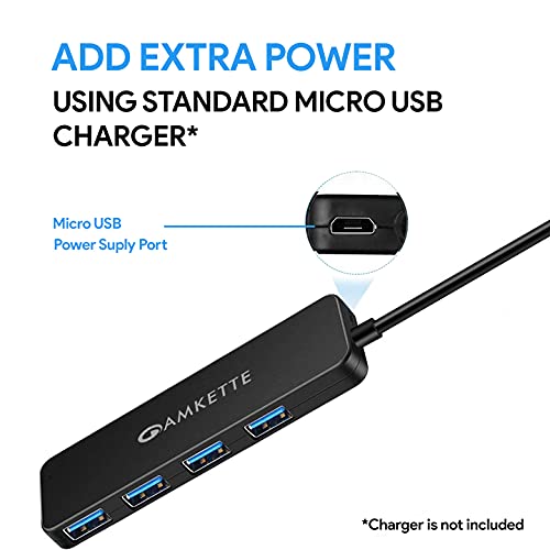 (Open Box) Amkette 4 Port Superspeed USB Hub 3.0 for PC/Laptops, Portable Data Hub with Hi-Speed Data Transfer Up to 5 GBPS |Charging Function| Strong and Durable| Power Supply Port and 80 cm Long Cable (Black)
