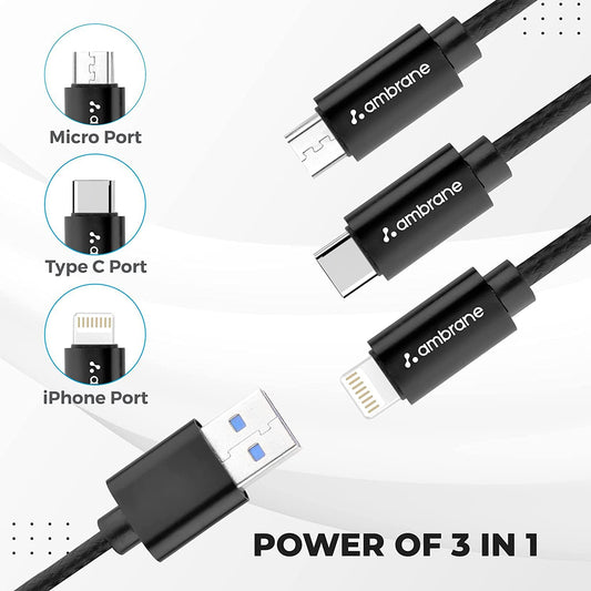 (Open Box) Ambrane Unbreakable 3 in 1 USB Fast Charging Cable with Type C, Lightning, Micro USB Port with 2.1 A, Compatible with iPhone, iPad, Samsung, OnePlus, Mi, Oppo, Vivo, Xiaomi, 1.25M (Trio-11, Black)