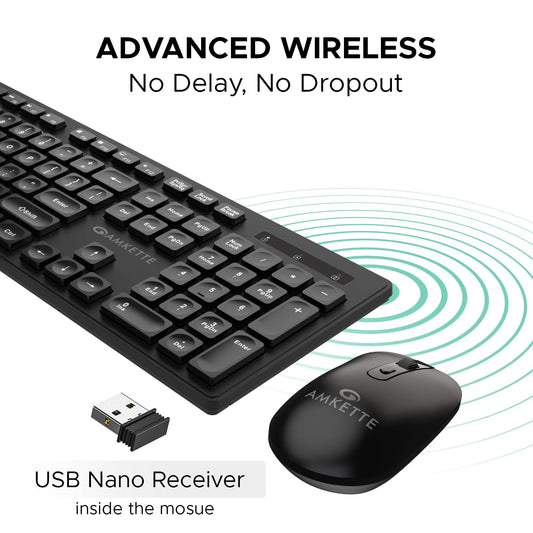 (Open Box) Amkette Primus Neo 2.4 Ghz Advanced Wireless Keyboard and Mouse Set | Intelligent Auto Sleep Function | Space Saving and Ergonomic | Mouse On/Off Switch | 3 DPI Settings | USB Nano Receiver (Black)