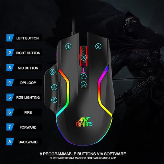 (Open Box) Ant Esports GM320 RGB Optical Wired Gaming Mouse | 8 Programmable Buttons | 12800 DPI I Ergonomic Design with Braided Cable - Black