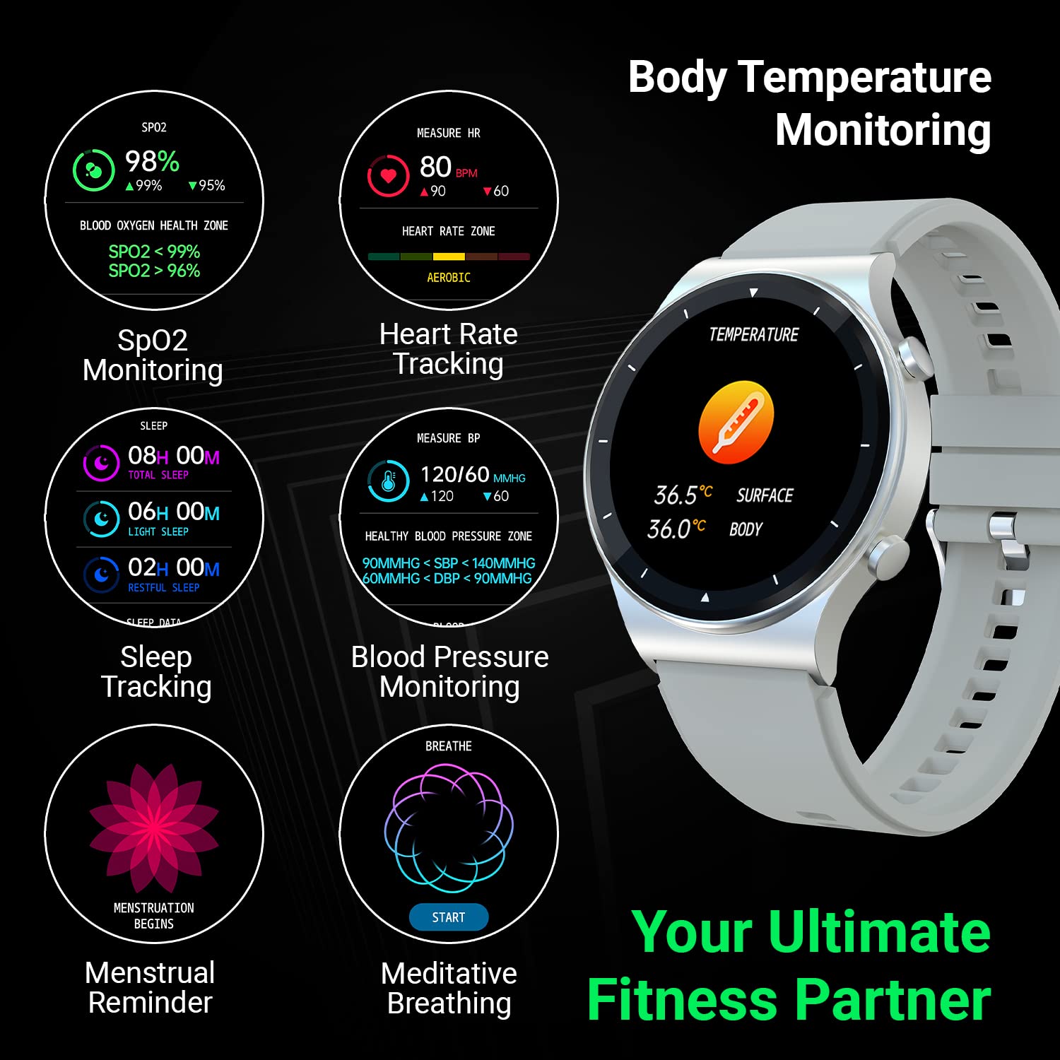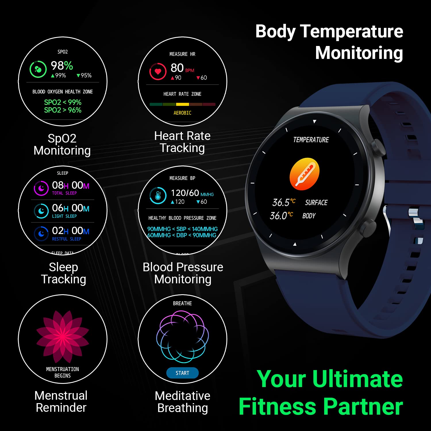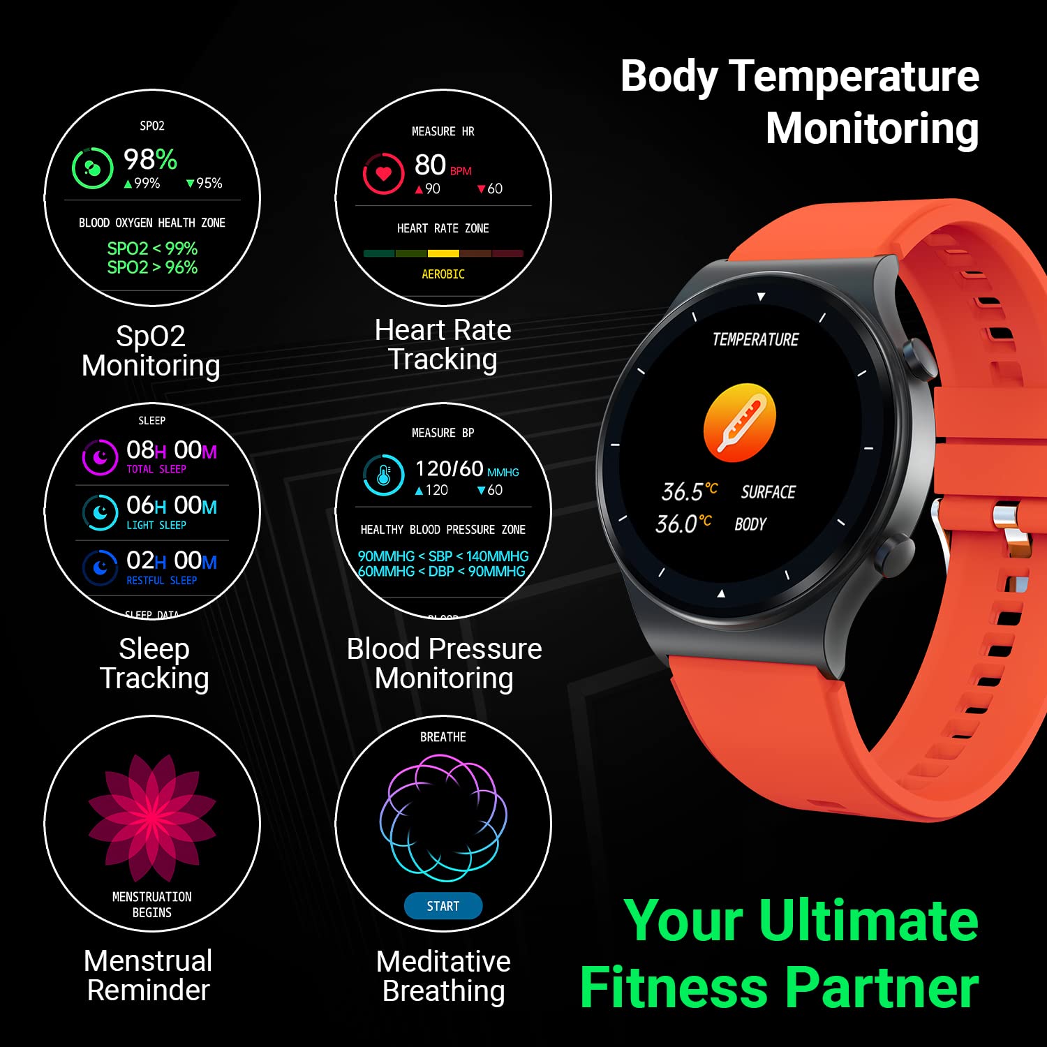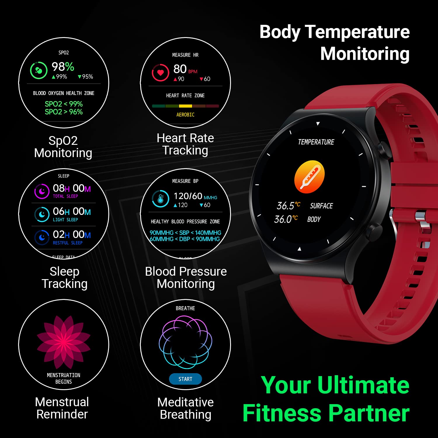• 【360*360 High "PRO" Display Resolution】- 1.32 inches HD Color screen Full capacitive touch, supporting taps and swipes.; 【Temperature Monitoring】- The watch can monitor your temperature. 【SPO2/ Oxygen, Heart Rate】- Fire-Boltt 360 Pro Smartwatch comes with real time 24*7 SPO2 / Blood Oxygen tracking, Dynamic Heart Rate Monitoring
