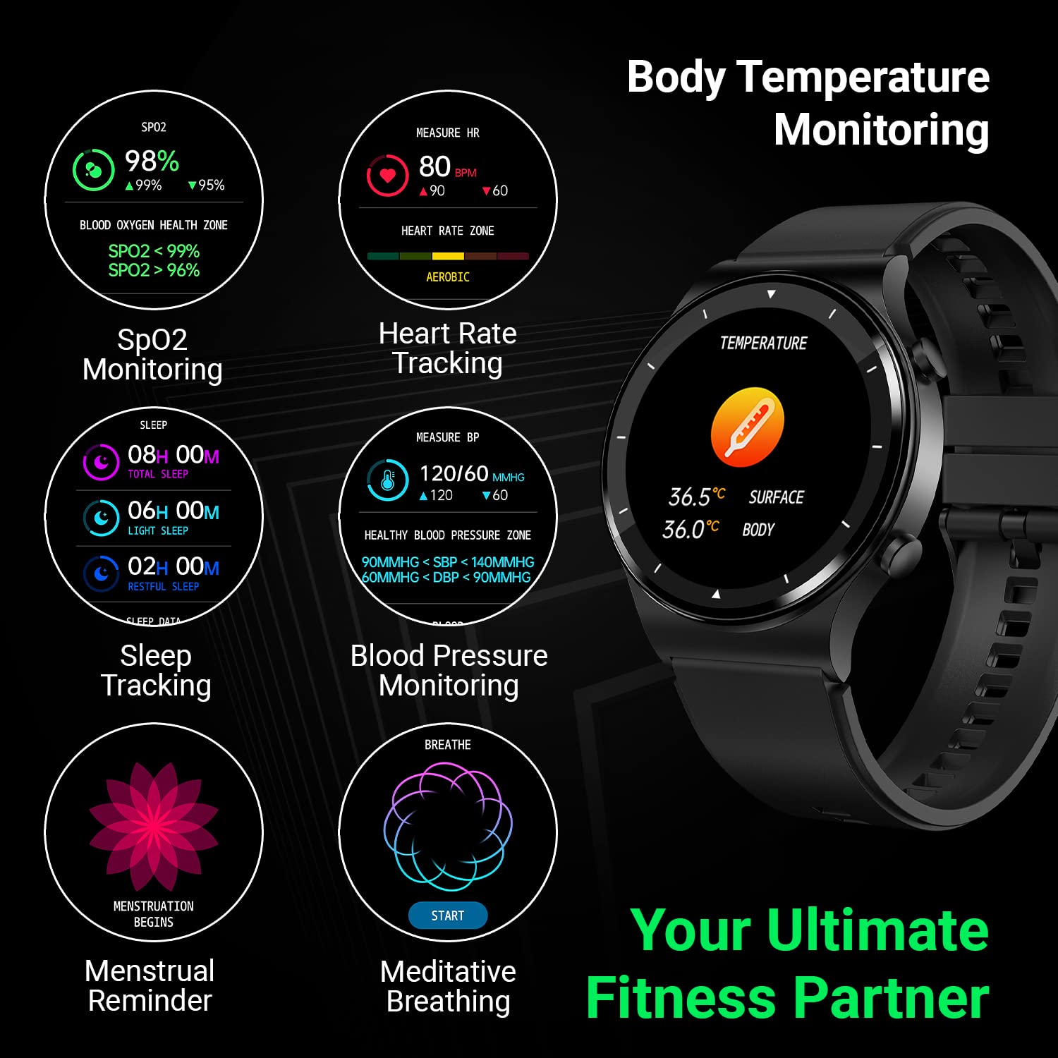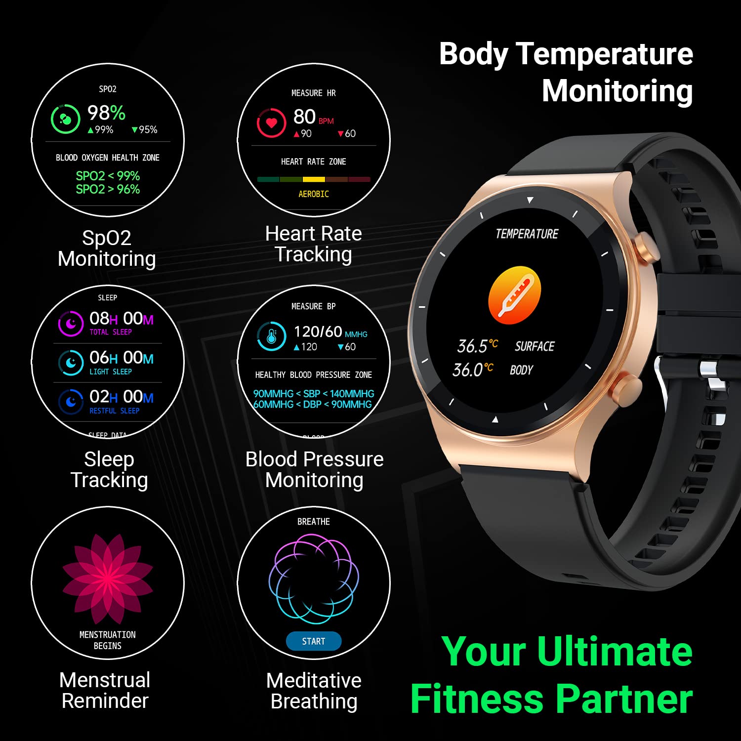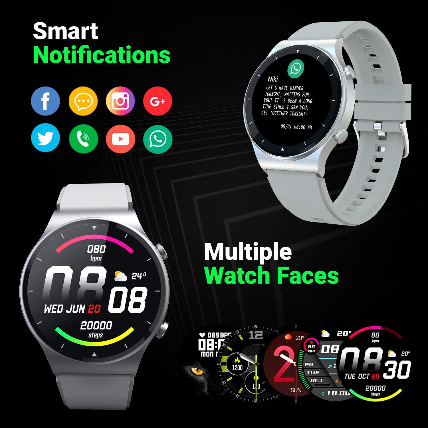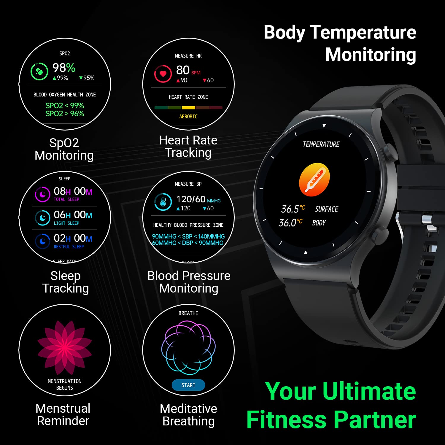 • 【360*360 High "PRO" Display Resolution】- 1.32 inches HD Color screen Full capacitive touch, supporting taps and swipes.; 【Temperature Monitoring】- The watch can monitor your temperature. 【SPO2/ Oxygen, Heart Rate】- Fire-Boltt 360 Pro Smartwatch comes with real time 24*7 SPO2 / Blood Oxygen tracking, Dynamic Heart Rate Monitoring