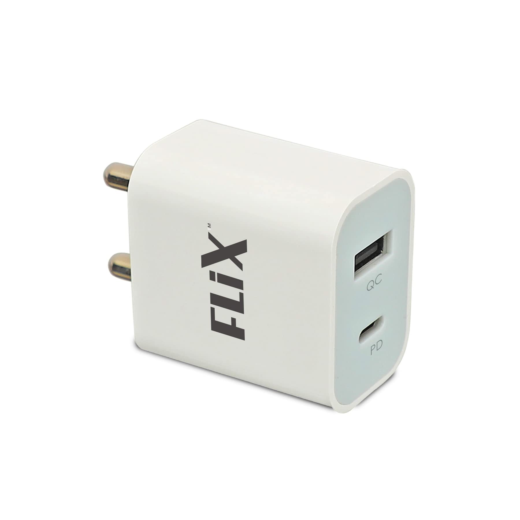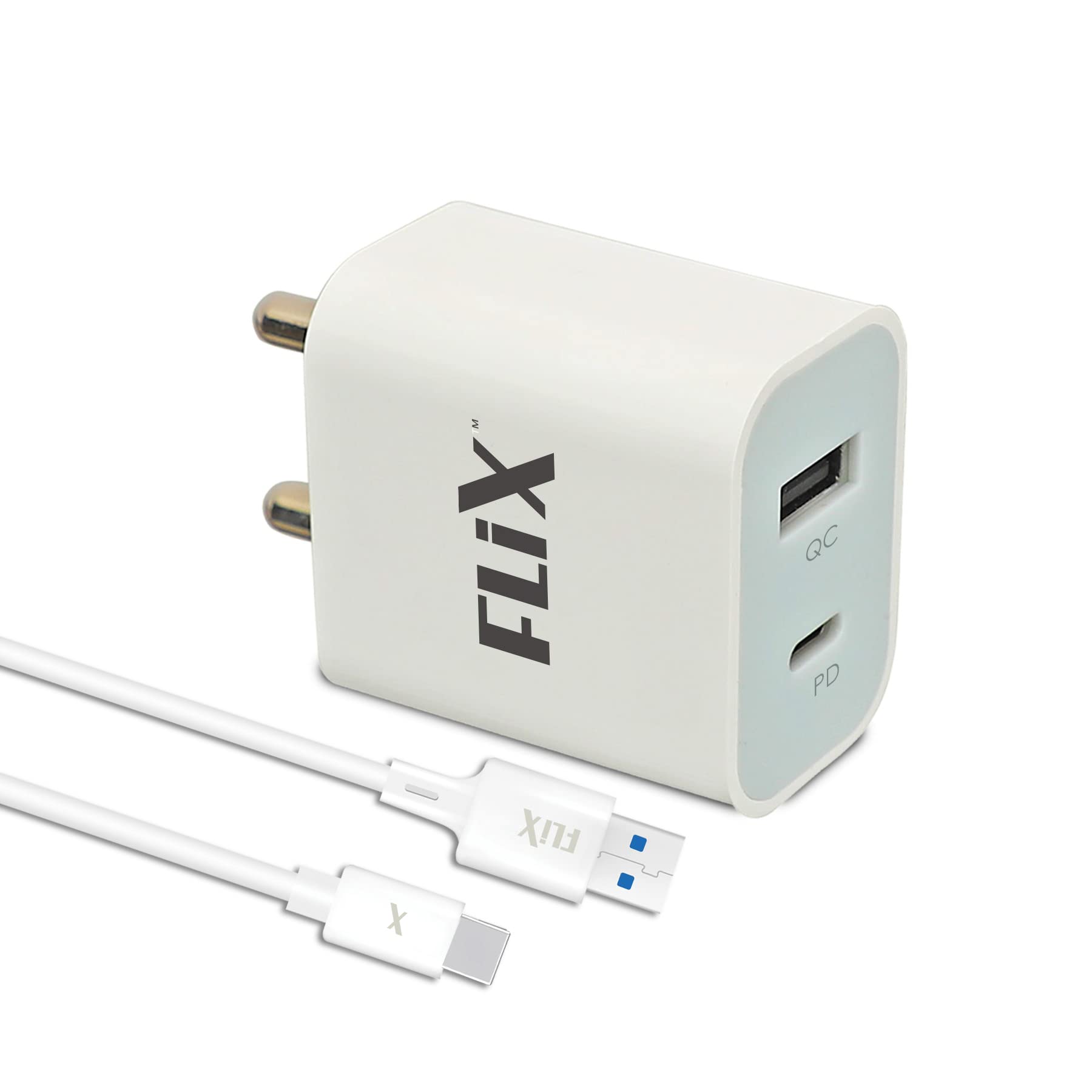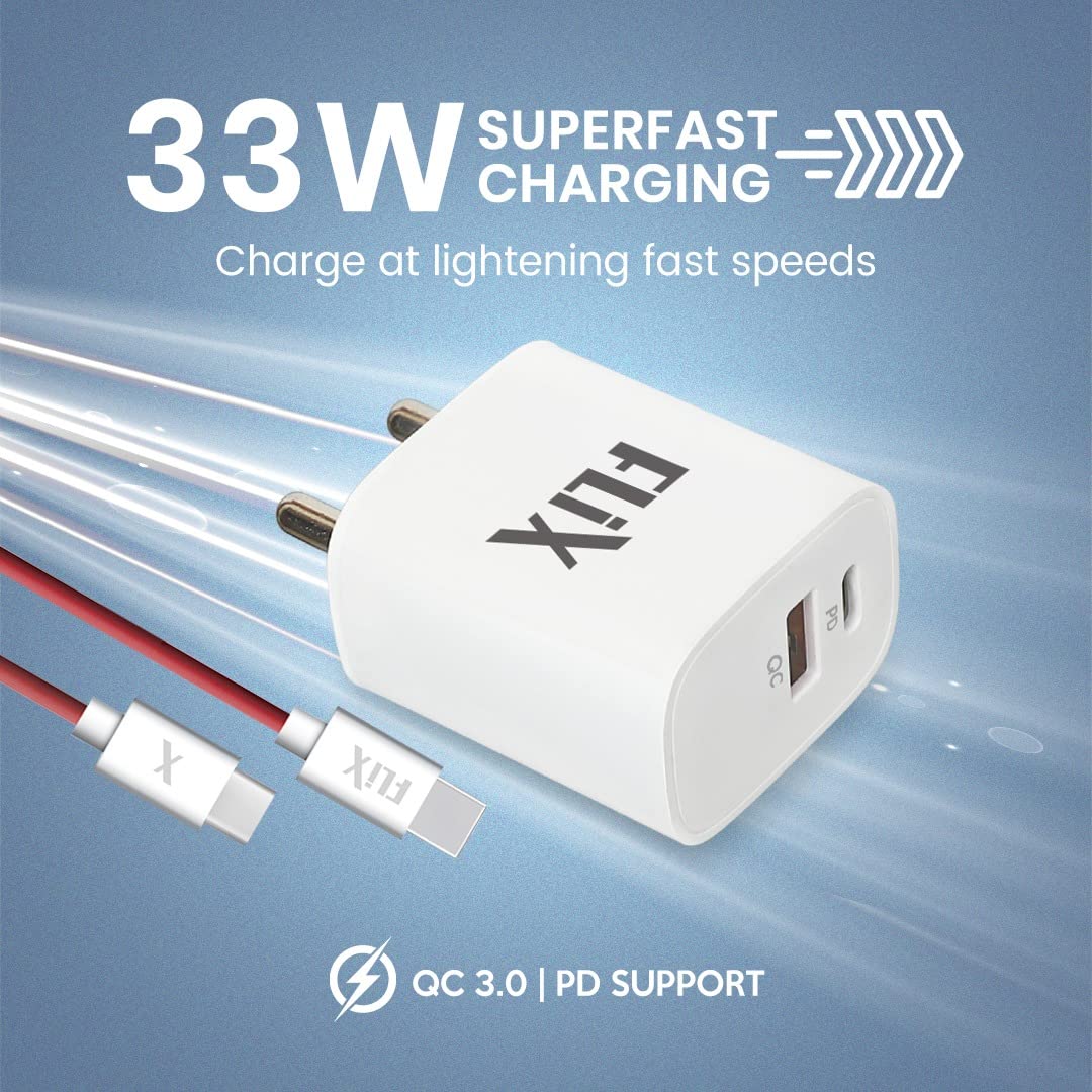 • FLiX Storm SD133 is a durable wall charger made of high-quality material, Super-fast charging with minimal heating 33W Charger Can be used to charge Smartphones (Android/IOS), Tablets, Smartwatch, Headphone, TWS, Speaker, Power banks, and many more Dual USB ports: USB Type C (PD) and USB Type A(QC)