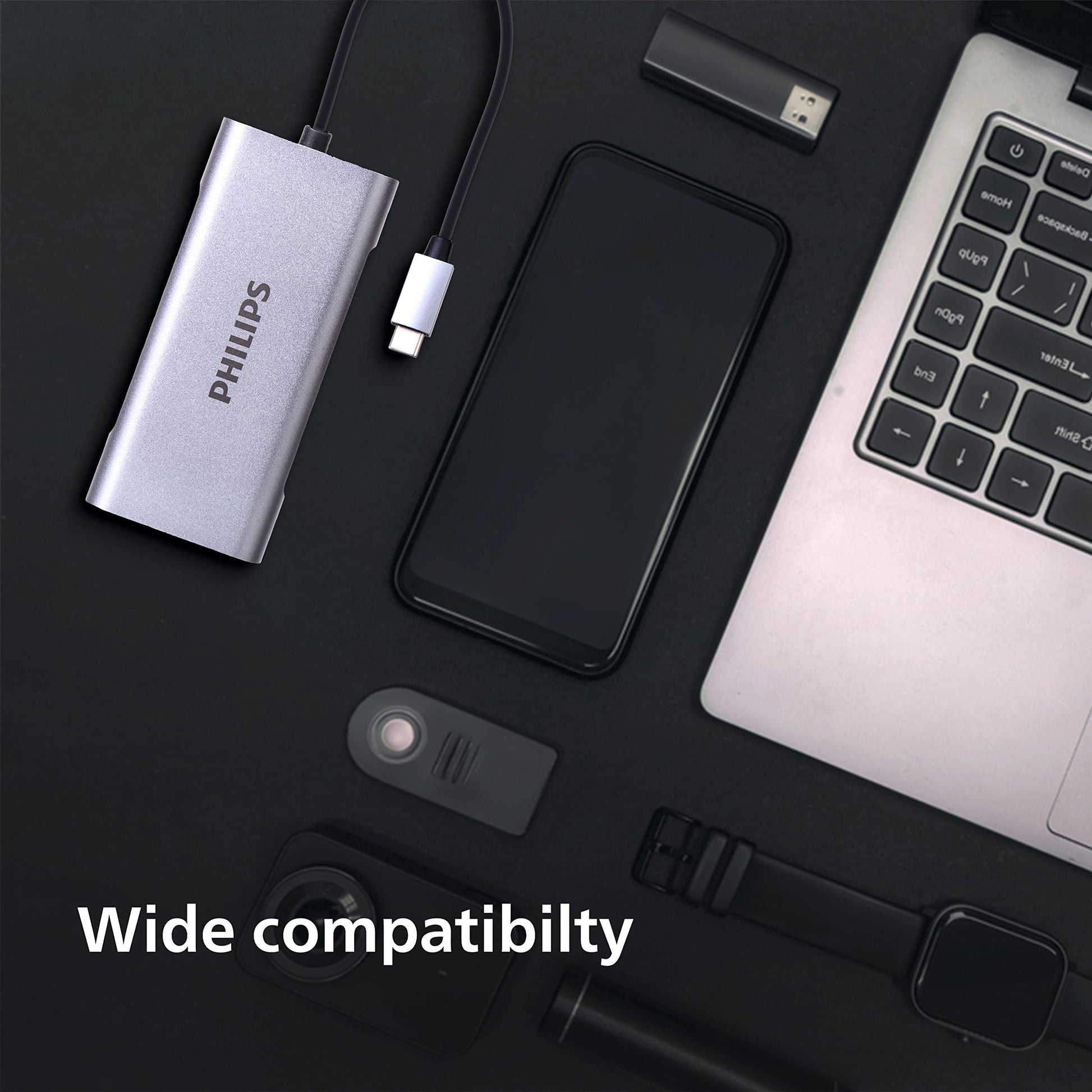 Philips 7 in 1 USB Docking HUB : Connect multiple devices through the hub to your laptop, including hard drives, monitors, projectors, mouse, keyboard, SD cards and more. It is Compatible with MacOS and Windows USB-C devices. Pass-through charging up to 60W theough PD 3.0 port. Support 5Gbps data transfer rate Ports: 3 x USB-A , 1 x USB-C, 1 x HDMI (4K 30Hz), 1 x SD card, 1 x Micro SD Card