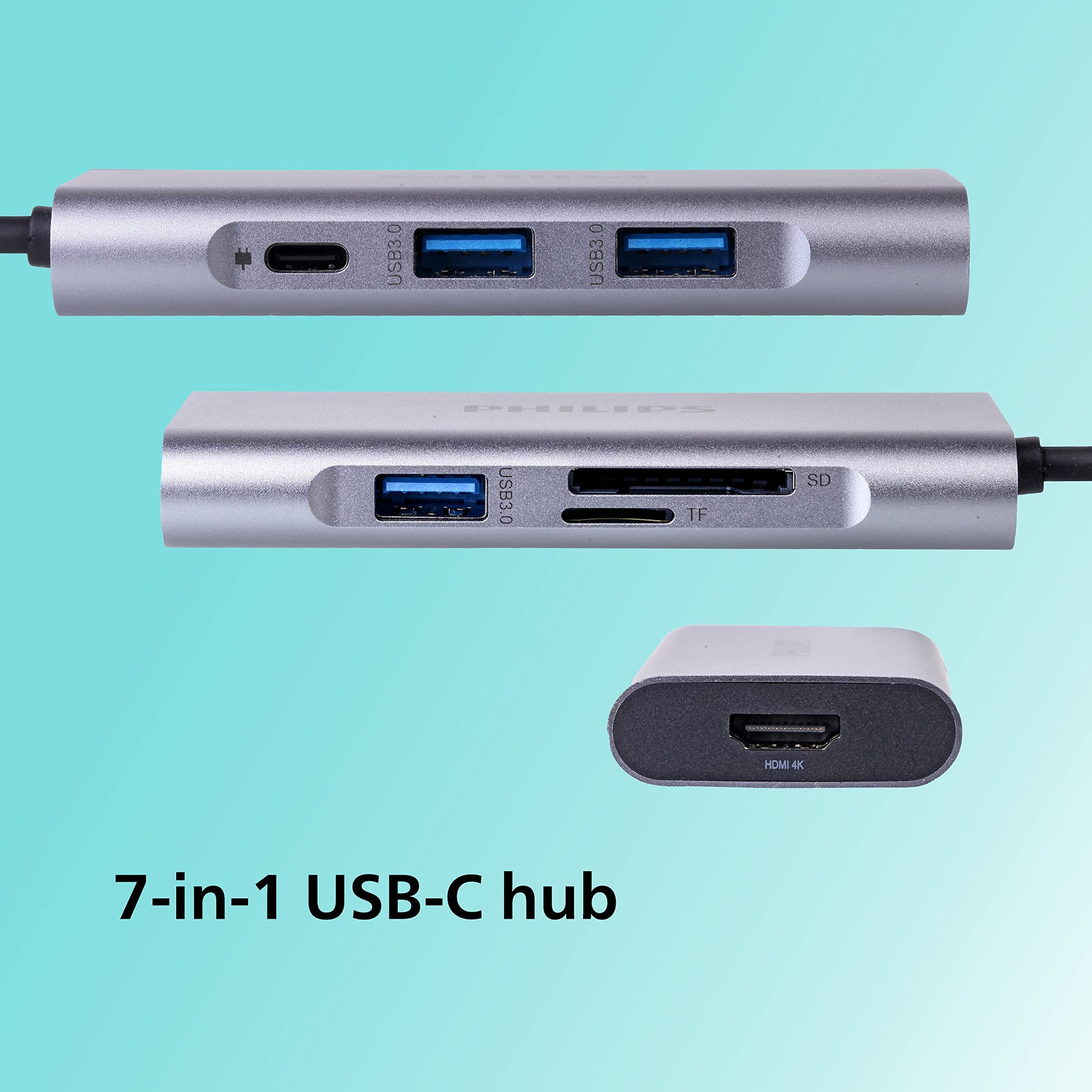(Open Box) PHILIPS 7 in 1 USB Type C to HDMI 4K 30Hz + 3 x USB A + PD (max 60W) + Micro SD Card Slot + SD Card Slot Dock Adapter for MacBook, Windows OS, iPad, Chromebook, Surface, Android Type C Port Devices