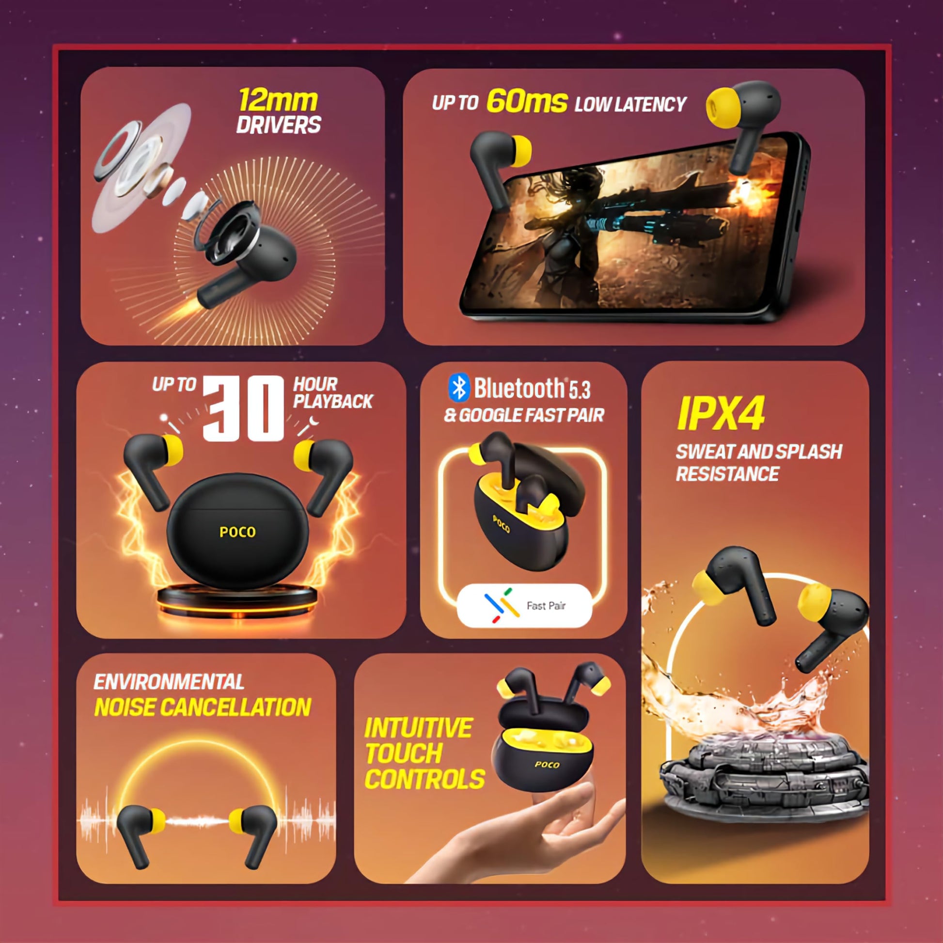 (OPEN BOX) POCO Pods with 30 Hour Playback, 12mm Drivers, 60ms Latency, Fast Charging & ENC Bluetooth Headset (Midnight Groove, True Wireless)